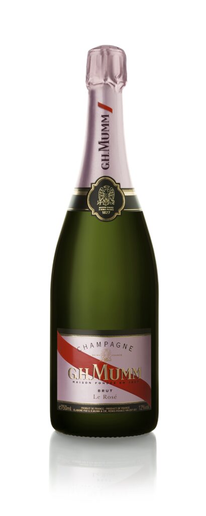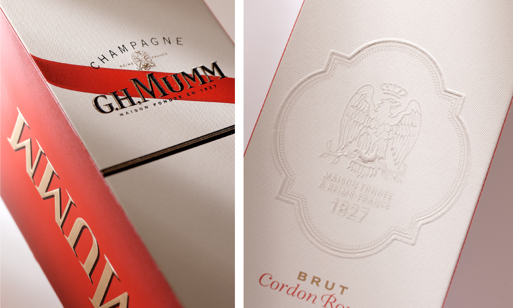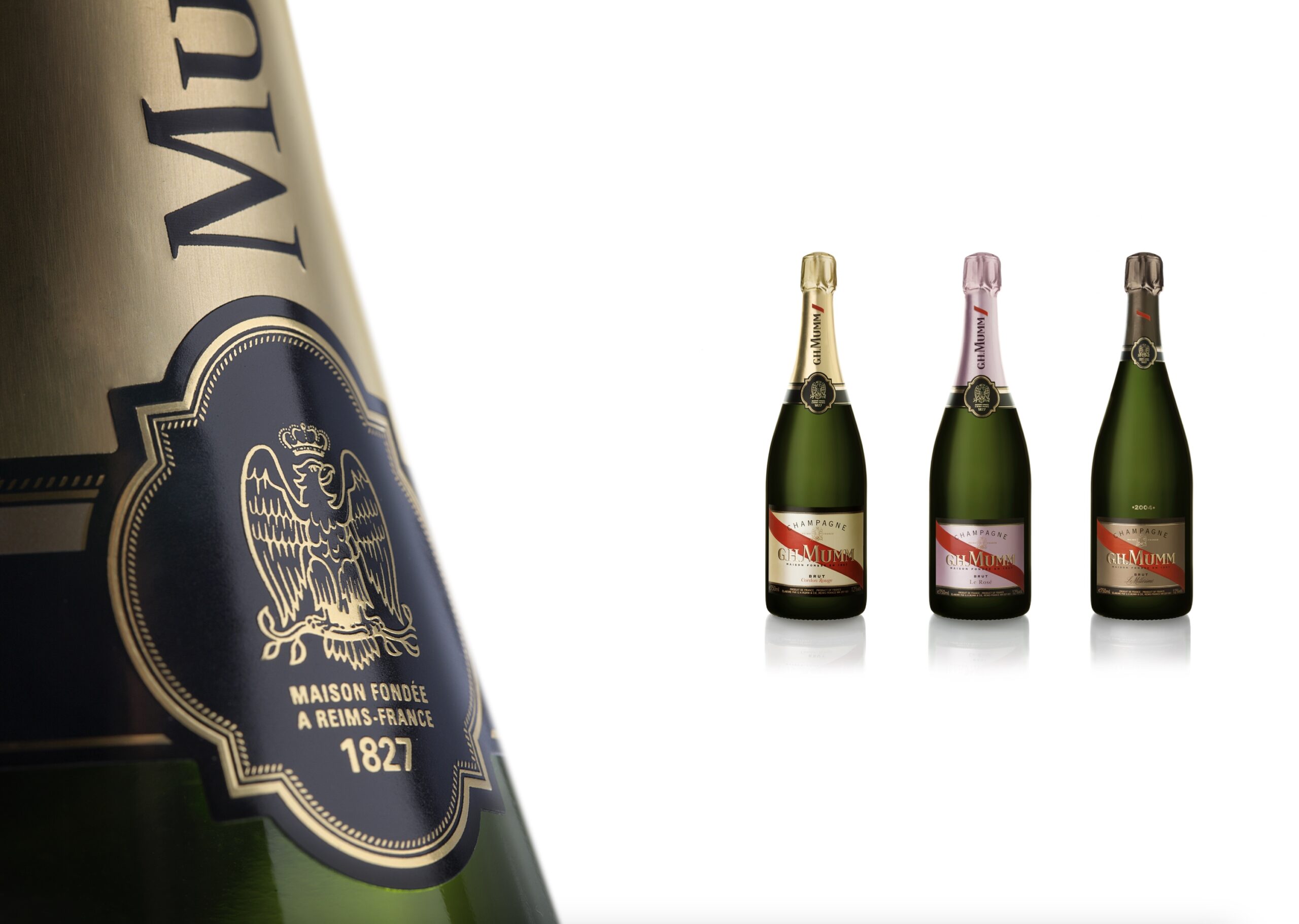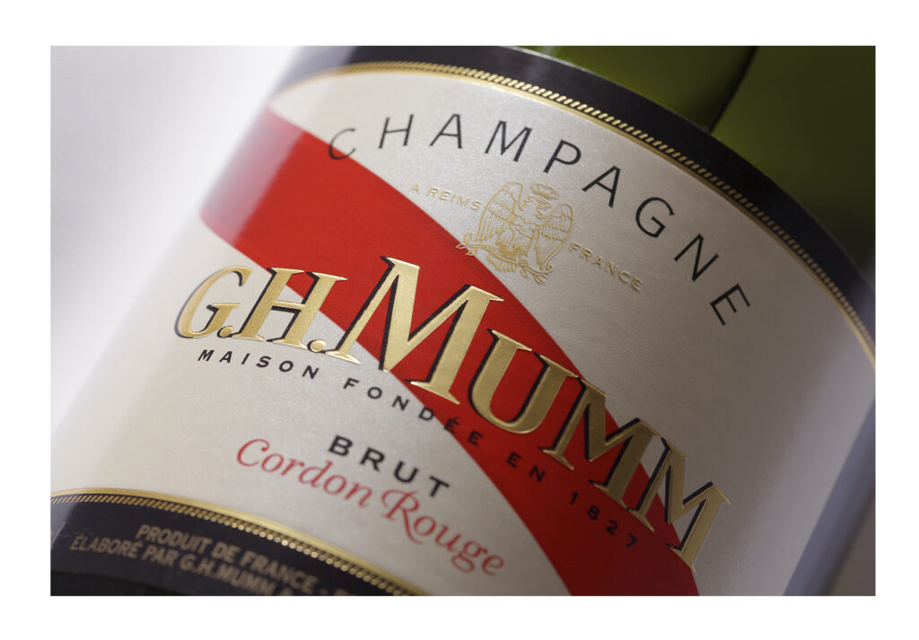 Mumm. Création de la gamme, dessin du blason d’origine et du ruban, réalisation des bouteilles et étuis Brut, Rosé, Millésime. Typographie Laurent Muller. Directrice artistique pour l’agence Brandimage.