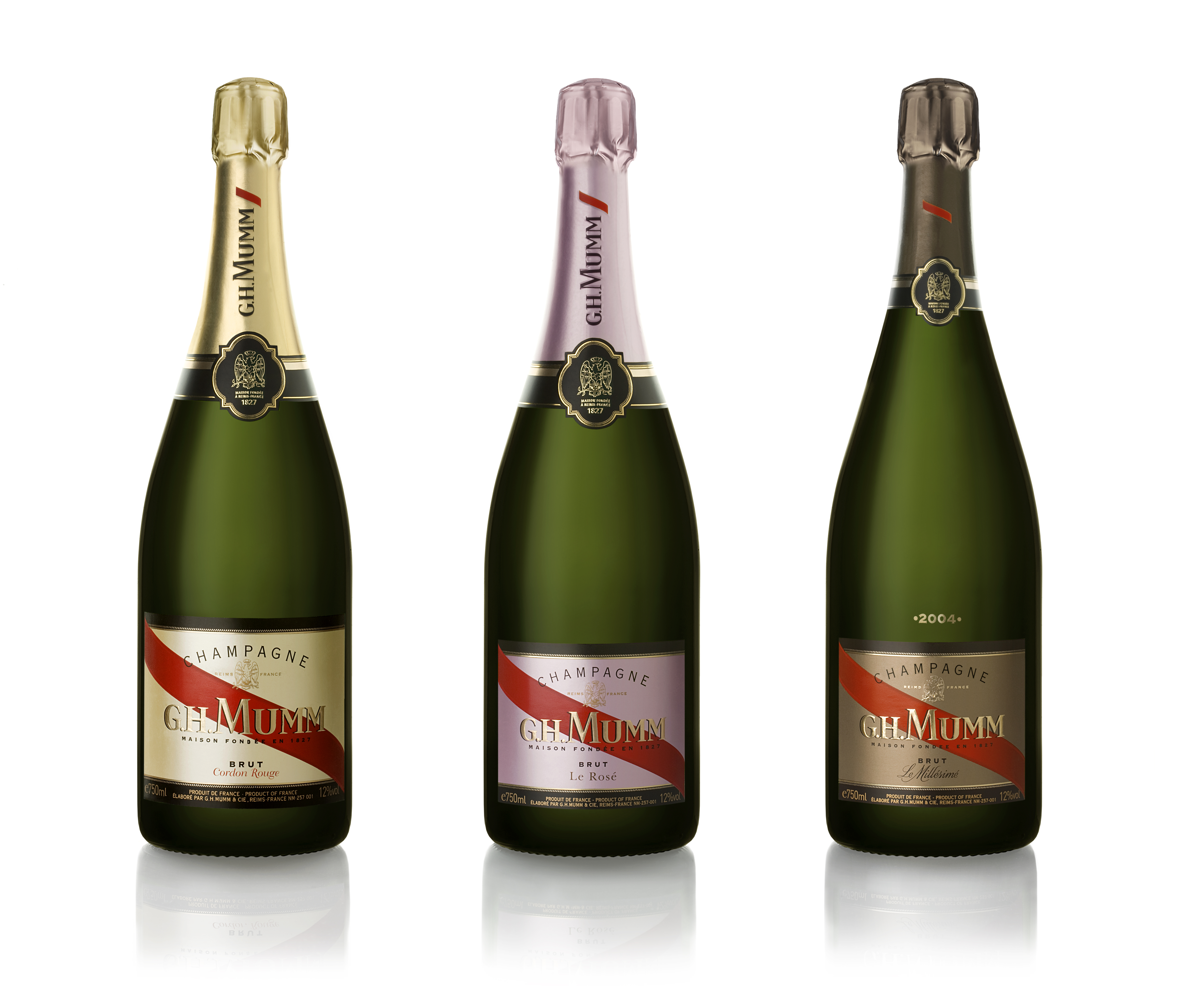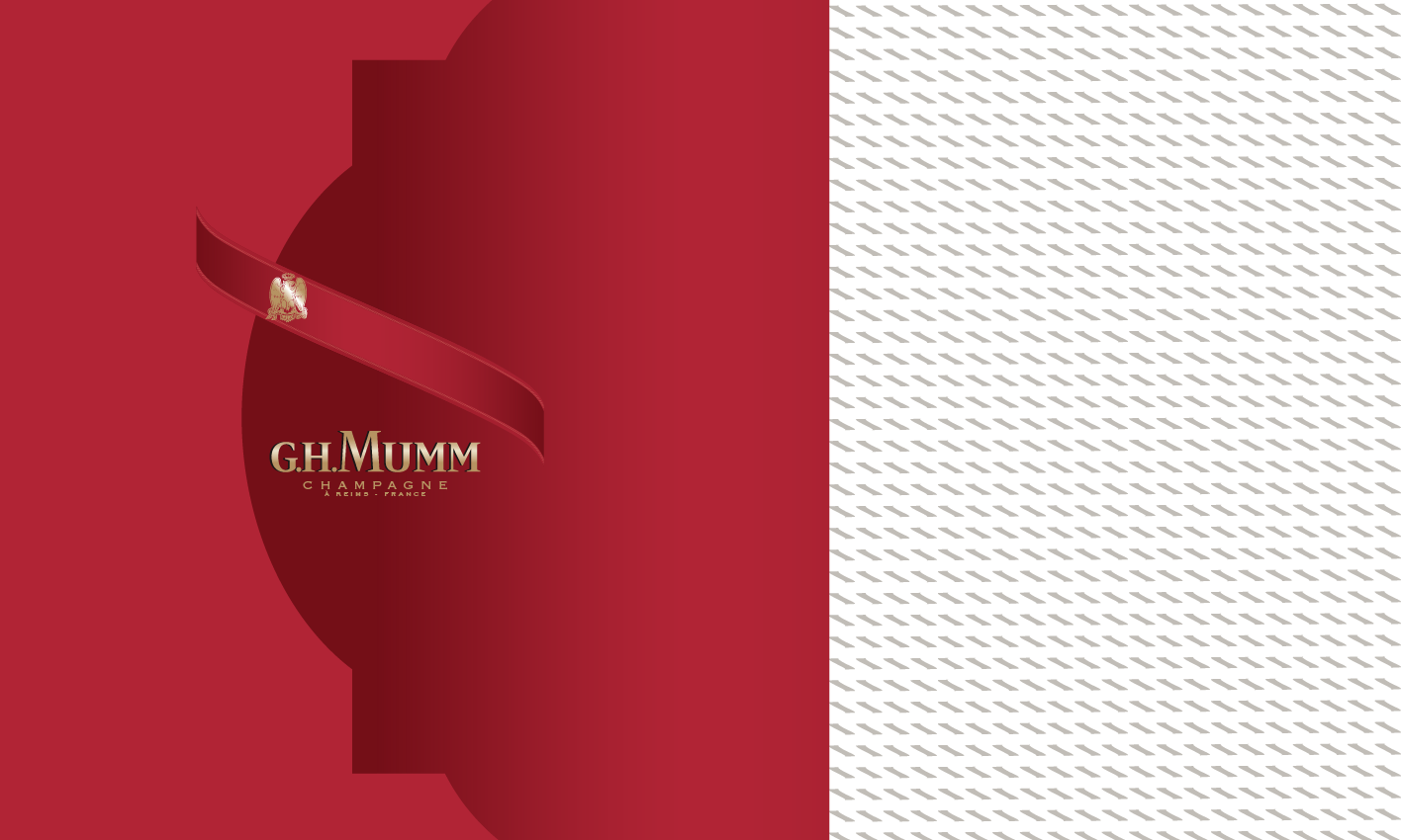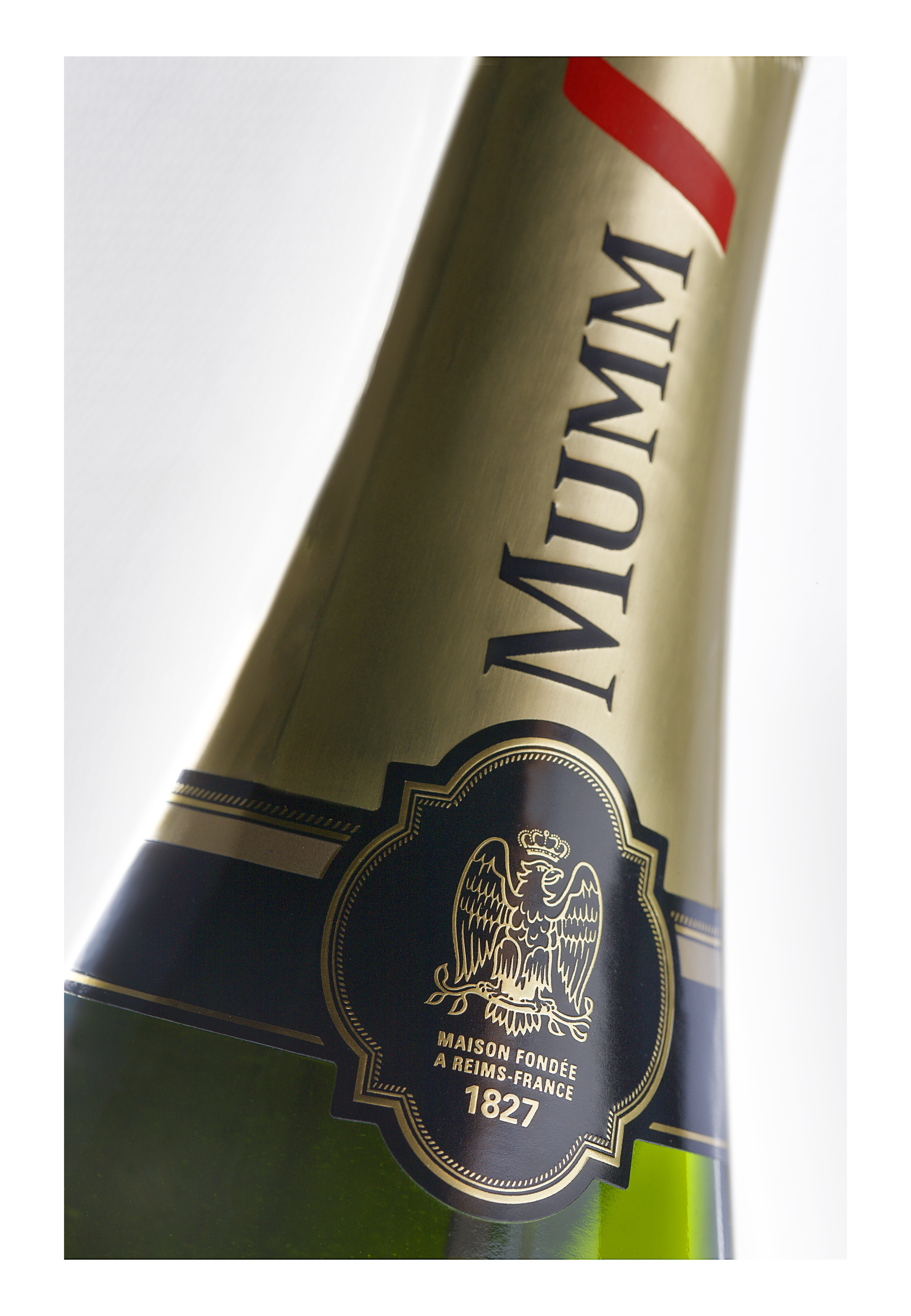 Création de l’identité visuelle et packaging Mumm, dessin du blason, bouteilles et étuis Brut . Rosé . Millésimé